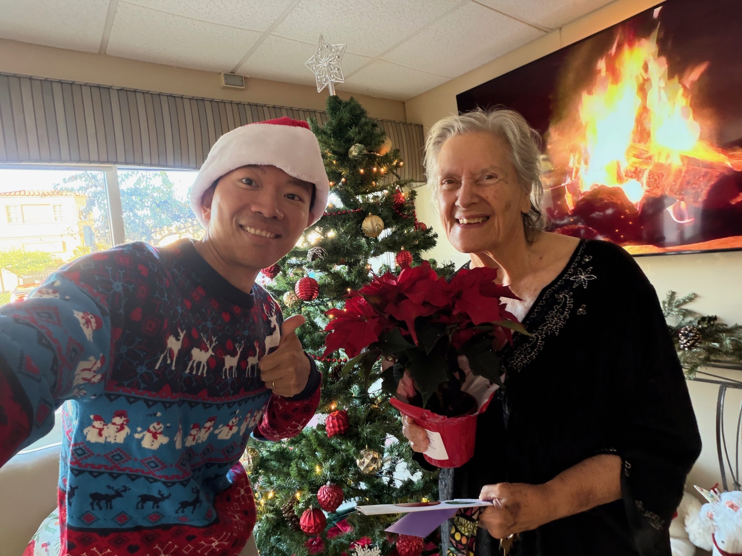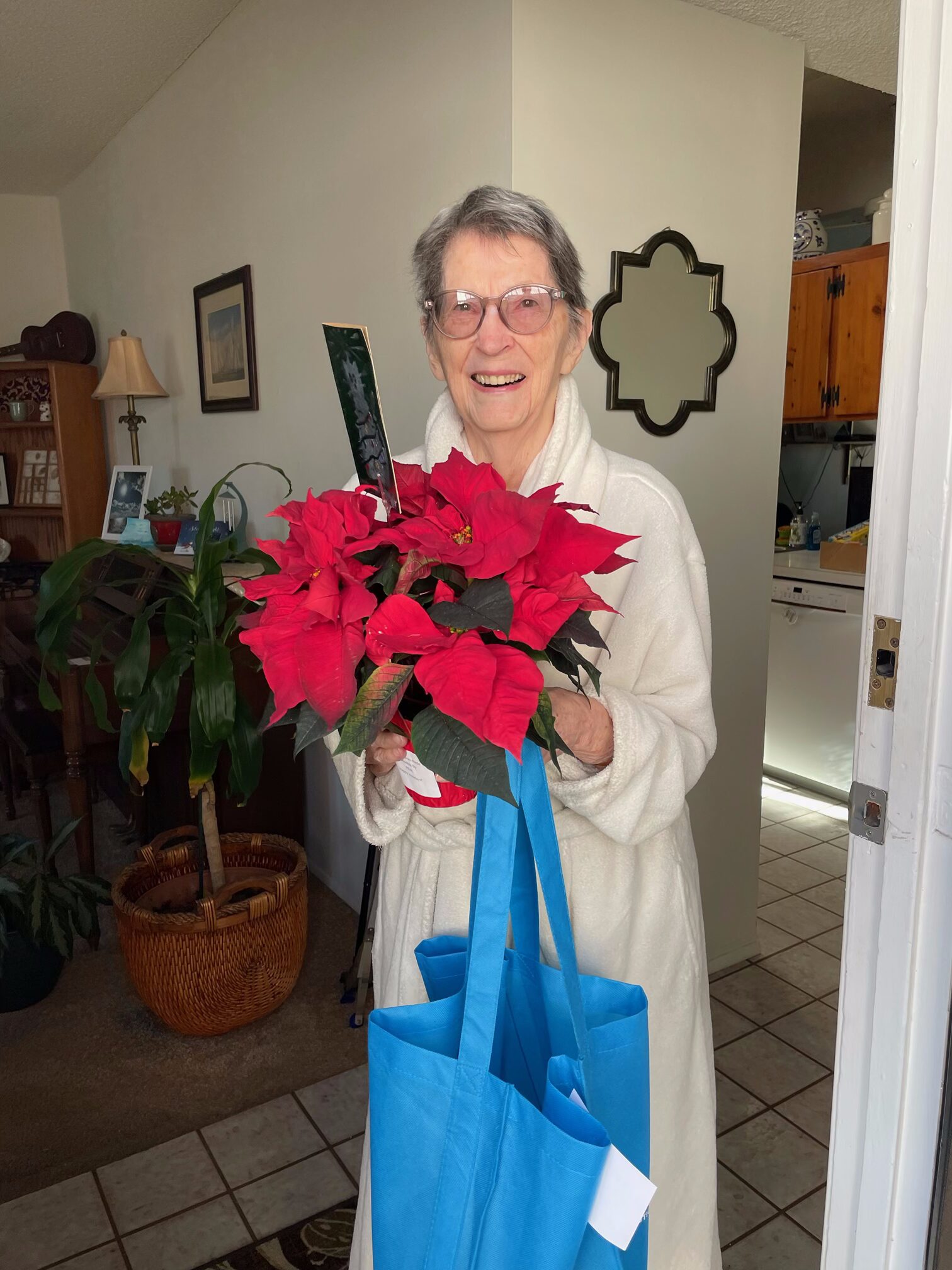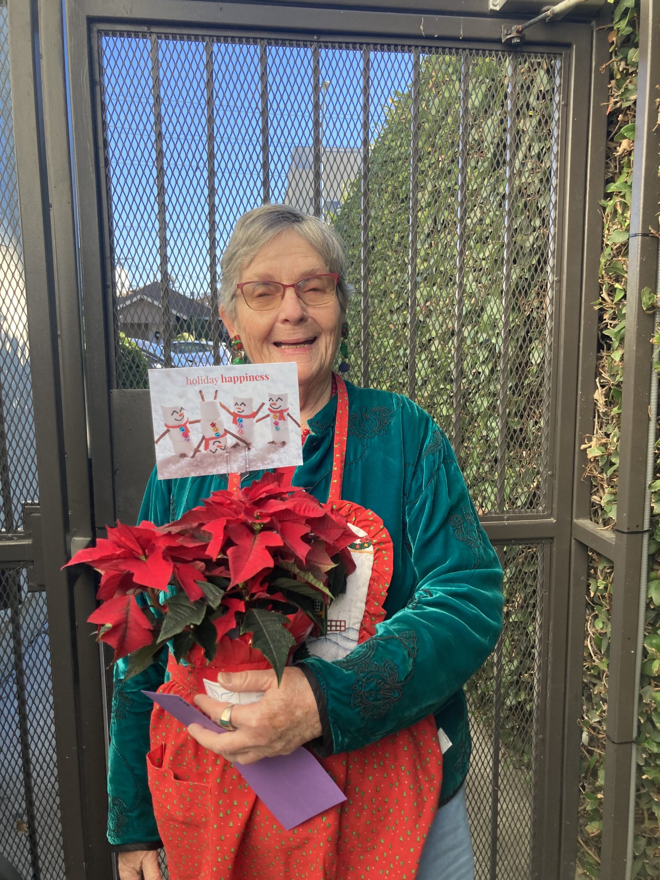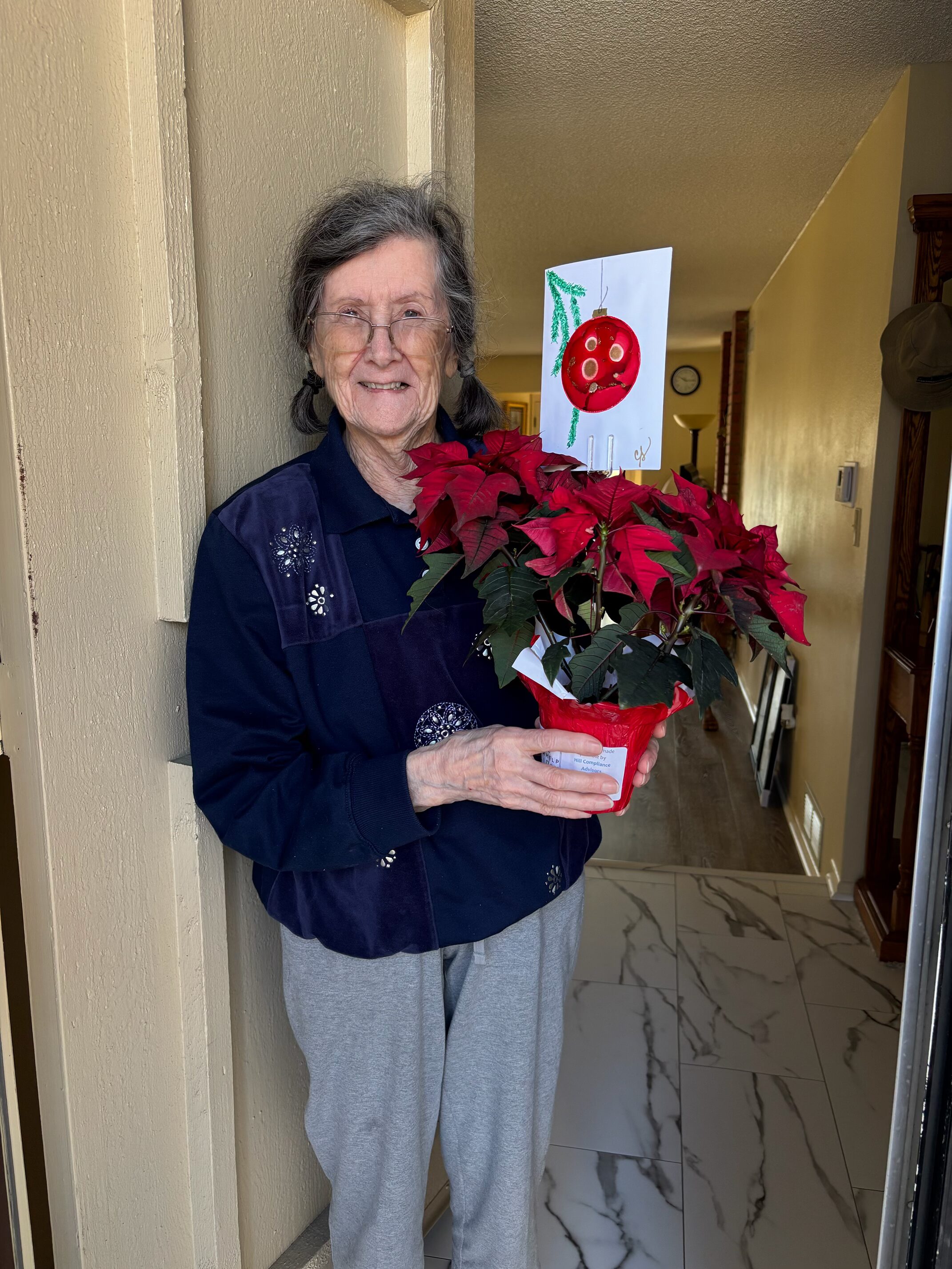 Thank you for helping us deliver joy on December 6, 2025. Each of our seniors received a poinsettia plant, gift card and hand made holiday greeting card, plus a friendly visit from a volunteer. Thank you to support from the David C. Copley Foundation and individuals like you for supporting this program. Scroll down to view photos.
